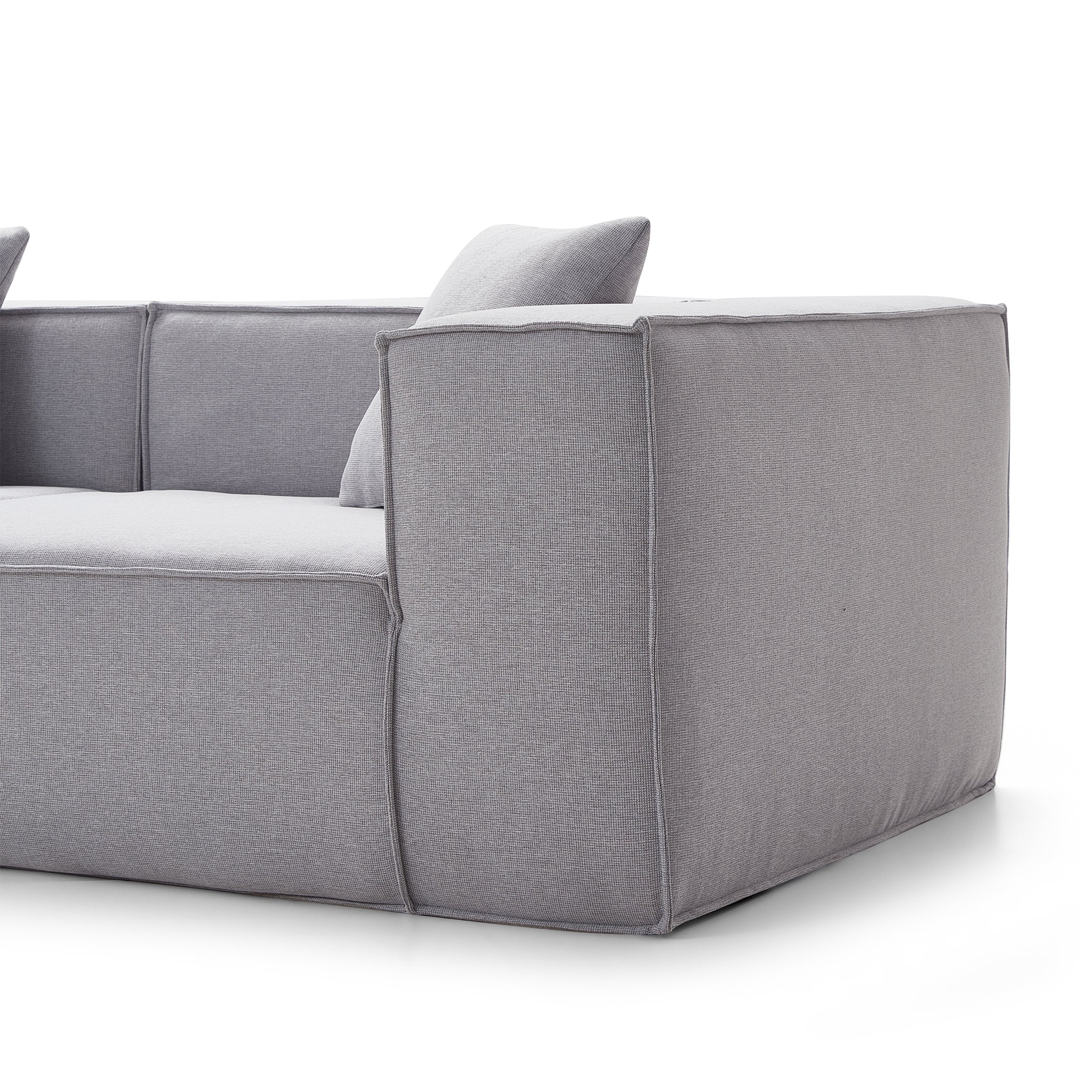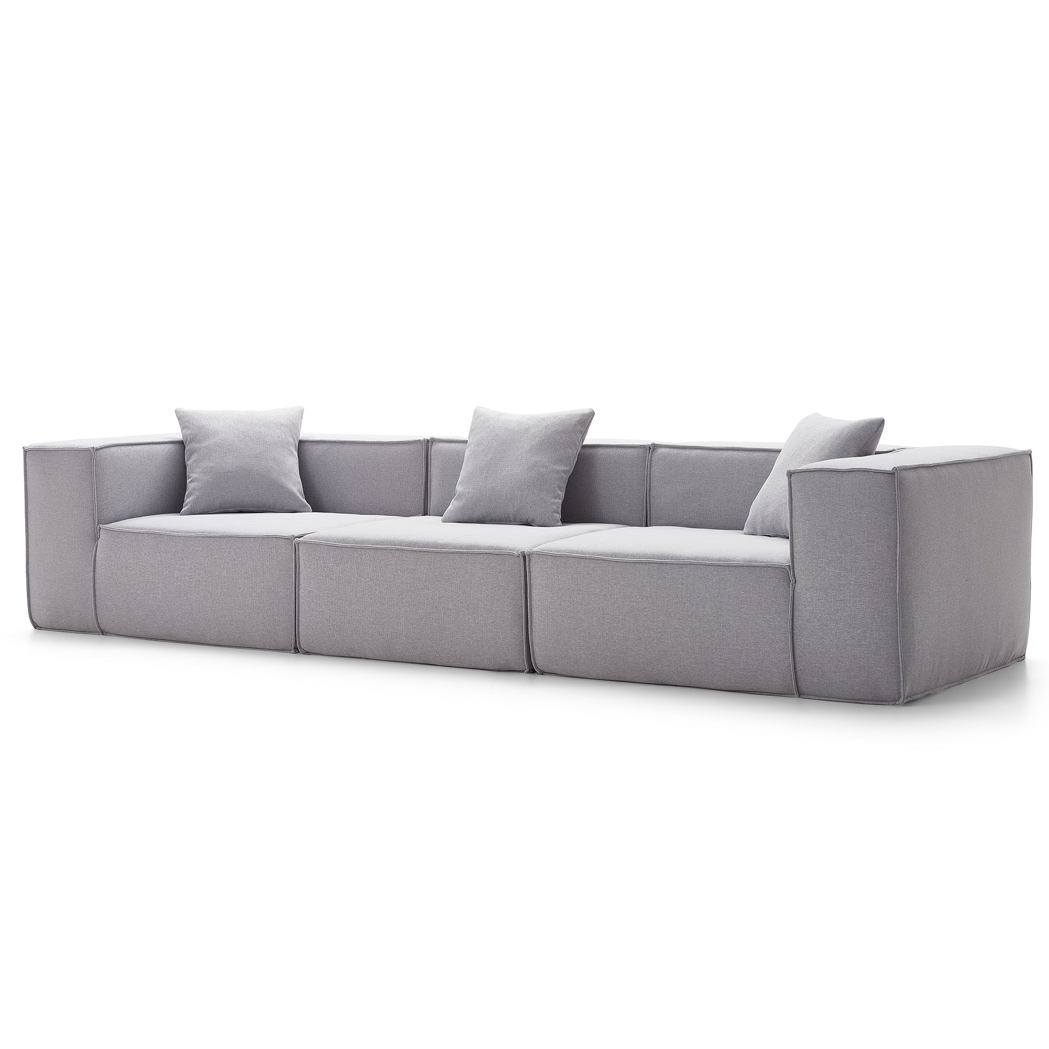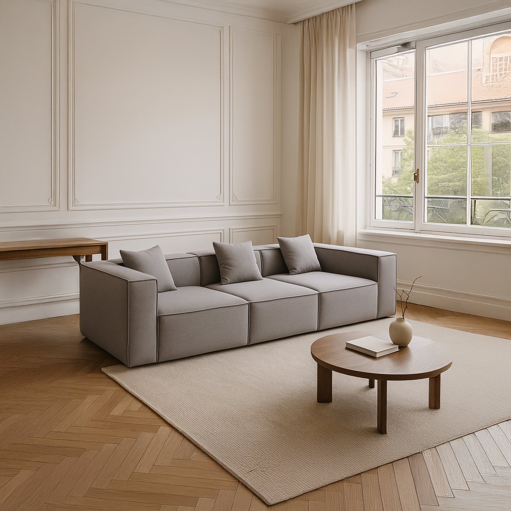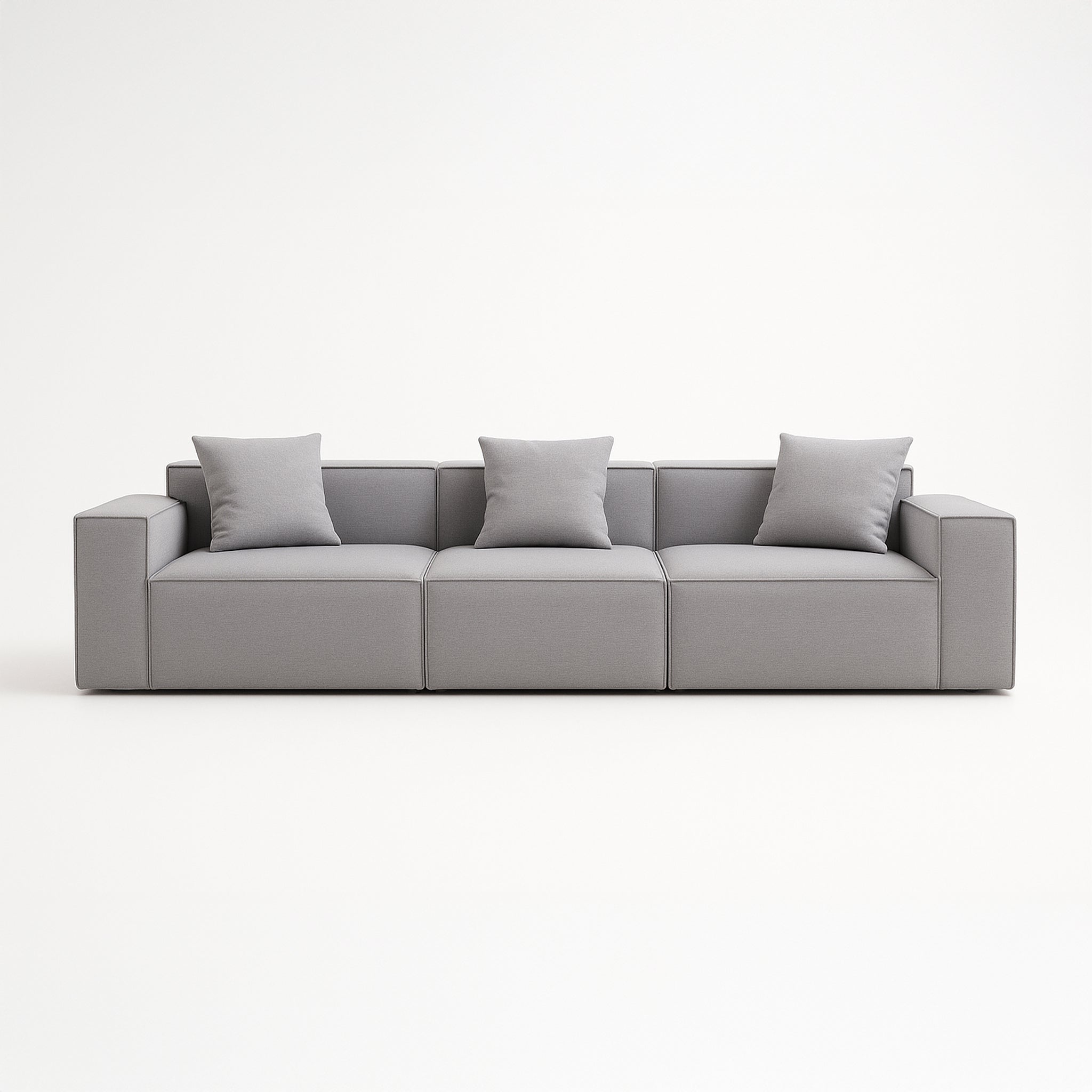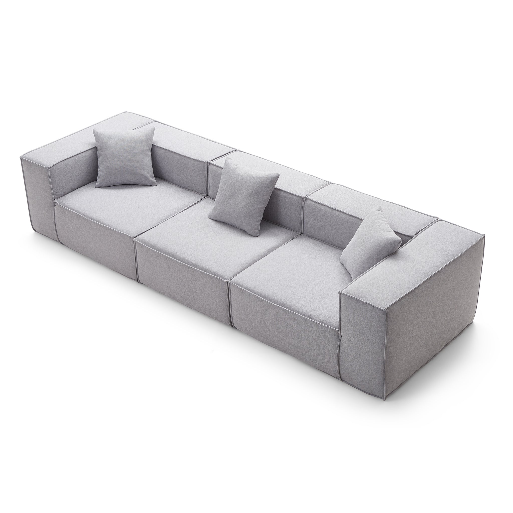 Minimalisme géométrique. Confort sur-mesure. Ce canapé 3 places en tissu gris clair incarne la pureté d’un design cubique contemporain allié à une technologie d’assise compressible unique.
